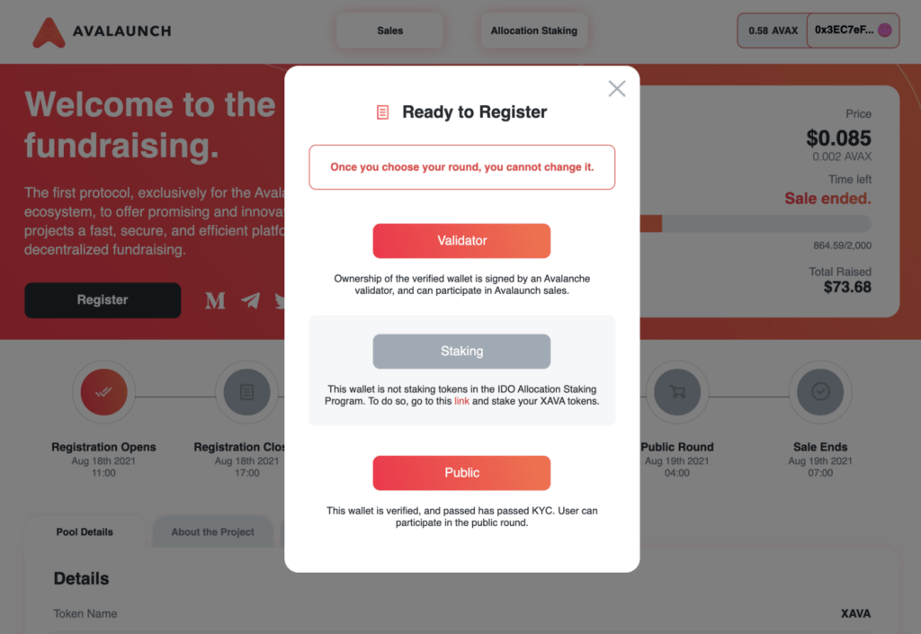 登録ができる期間であれば、以下のように「Register」を選択すると、ポップアップが表示されますので、そこから参加したいラウンドを選択します。以下の例は、ValidatorとPublicは選択できるが、Stakingは選択できない場合になります。恐らく、ほとんどの方はValidatorとして登録していないかと思いますので、XAVAをステークしてStakingを選択するのがよいかと思います(なお、ここ数回Publicラウンドはありませんでした)。またIDOによっては、登録の際にAVAXをデポジットする必要があります(デポジットしたAVAXはIDO終了後に戻ってきます)。