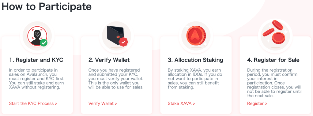 続いて、AvalaunchでIDOに参加するまでの流れを説明したいと思います。IDOに参加するためには以下の4つのステップが必要になります。順を追って見ていきましょう。