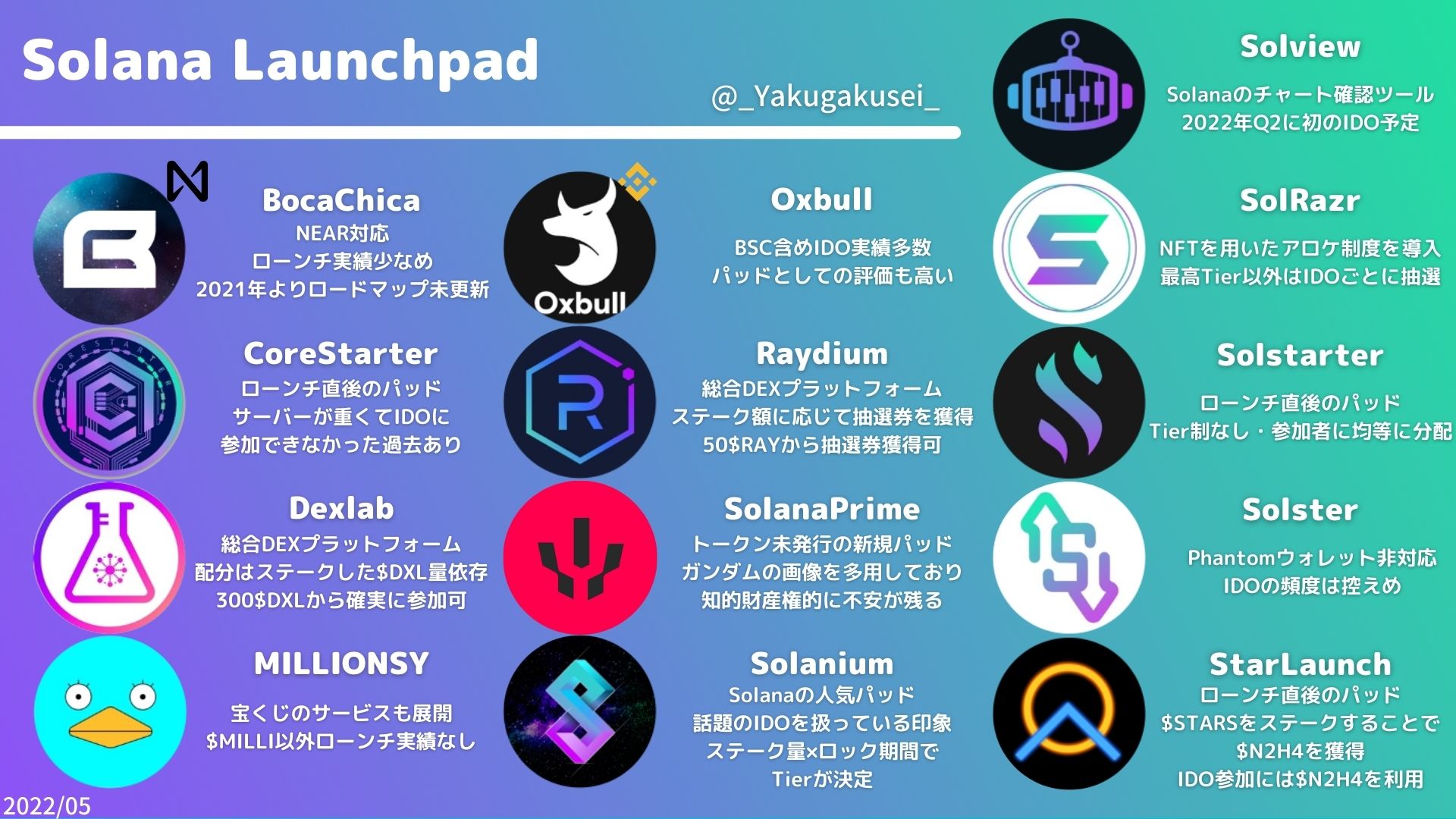 やはり、『Solanium』は、Solanaのローンチパッドの中だと一番人気であり、ローンチするプロジェクトも質が高い印象です。また、『Oxbull』はSolanaの他BSCなどのプロジェクトも対応しており、こちらも全体的にポテンシャルが高いです。