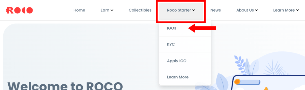 続いてROCOのステーク以降のステップについてです。まず、ページ上部のメニューから「Roco Starter」の項目の中にある「IGOs」を選択します。