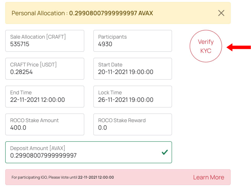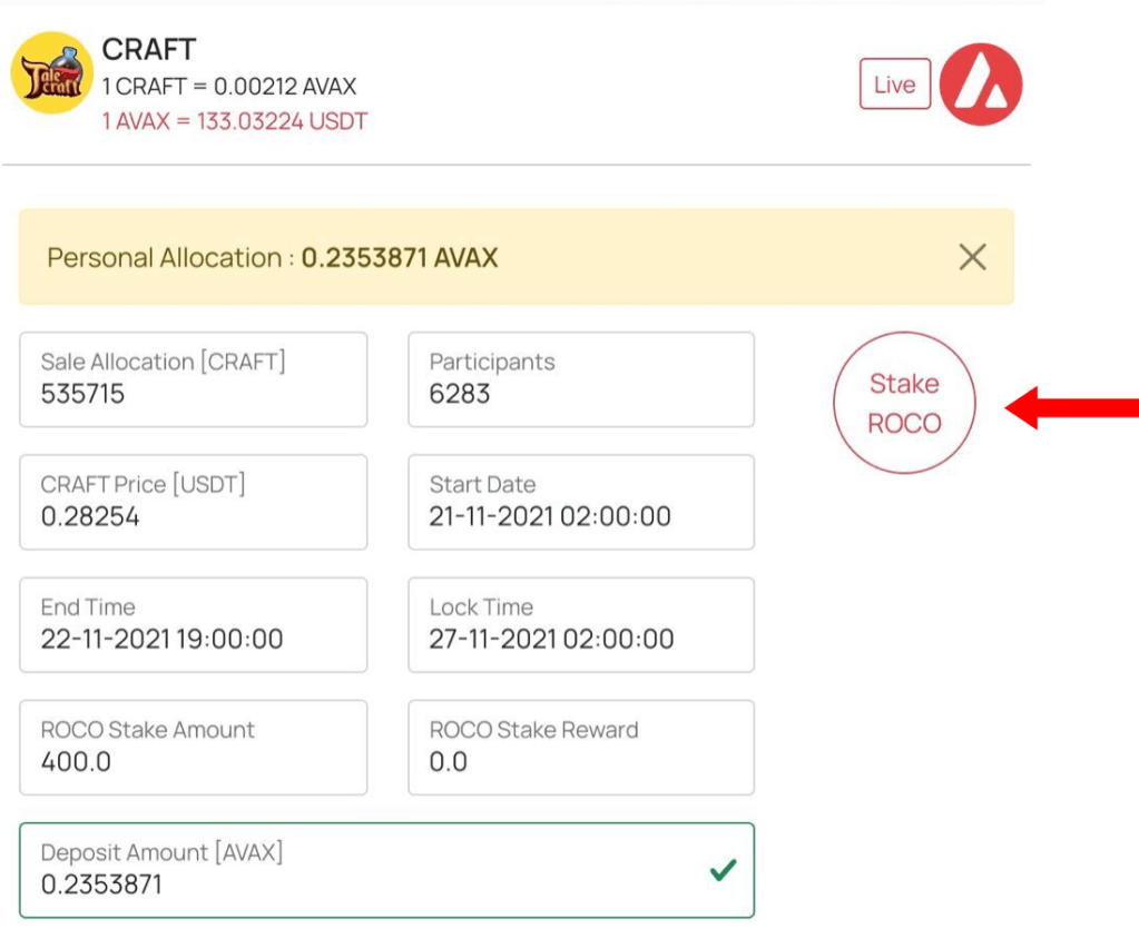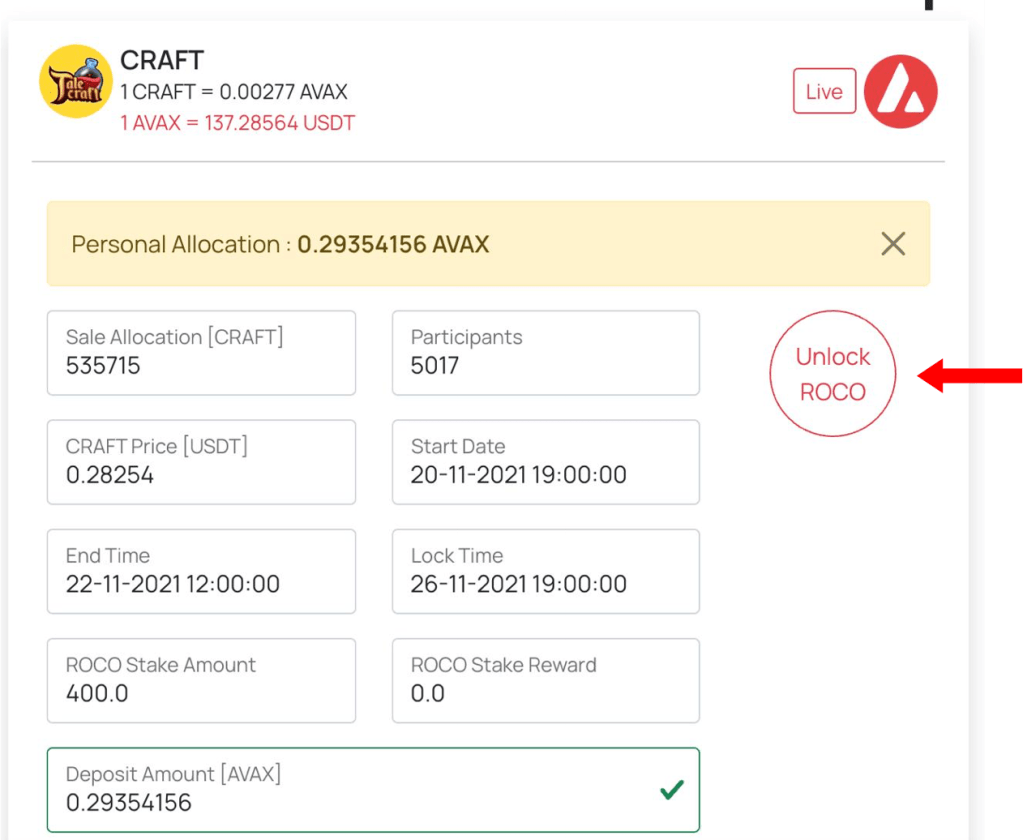 アンロックが完了したら、ROCOをステークしましょう。例で示しているTaleCraftのIGOでは、400ROCOをステークする必要がありましたので、「ROCO Stake Amount」を400として、「Stake ROCO」を選択します。