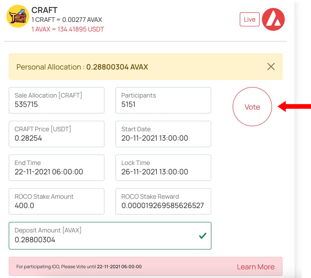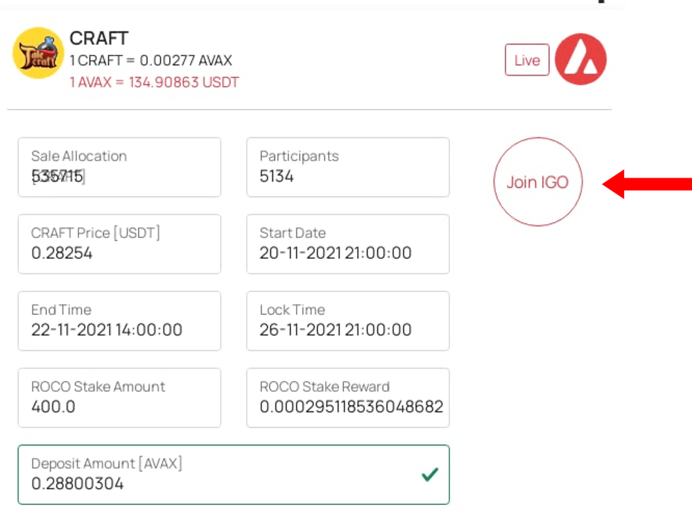 ROCOのステーク期間が終了すると、「Join IGO」を選択できるようになります。このタイミングで、新しく発行されるトークンを購入するのに必要なAVAXを預けることになりますので、十分なAVAXを用意しておきましょう。
