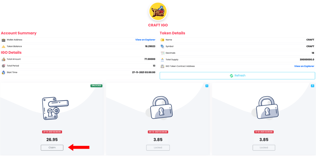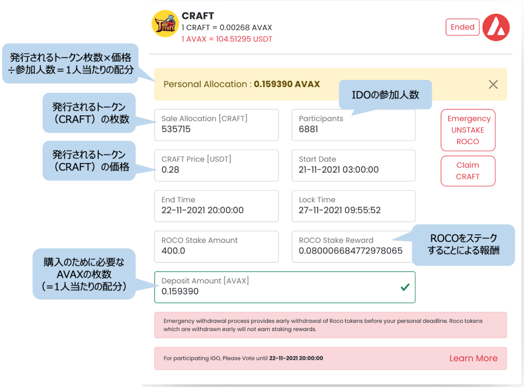 IDOへの参加手続きが終了すると、以下のように表示されるかと思います。簡単に、記載されている情報の説明も載せています。購入したトークンを受け取ることができるタイミングになりましたら、「Claim CRAFT」(CRAFTの箇所はIDOによって変わります)を選択しましょう。