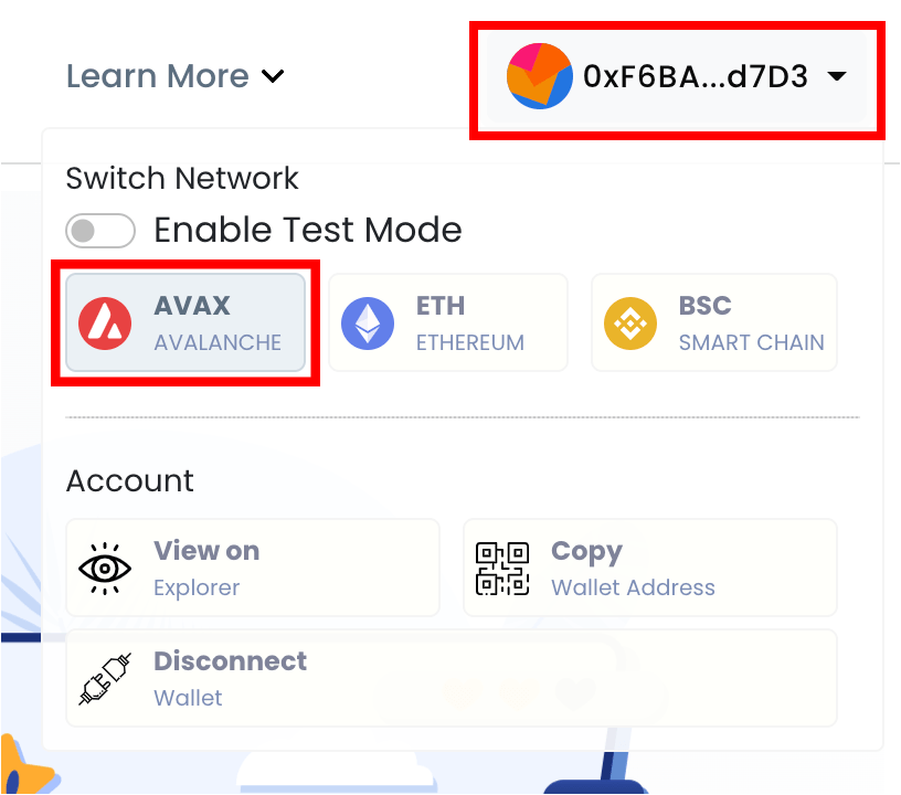 まず、トップページ右上のボタンを選択しウォレットを接続しましょう。その後、AVAXのチェーンを選択していることを確認します。