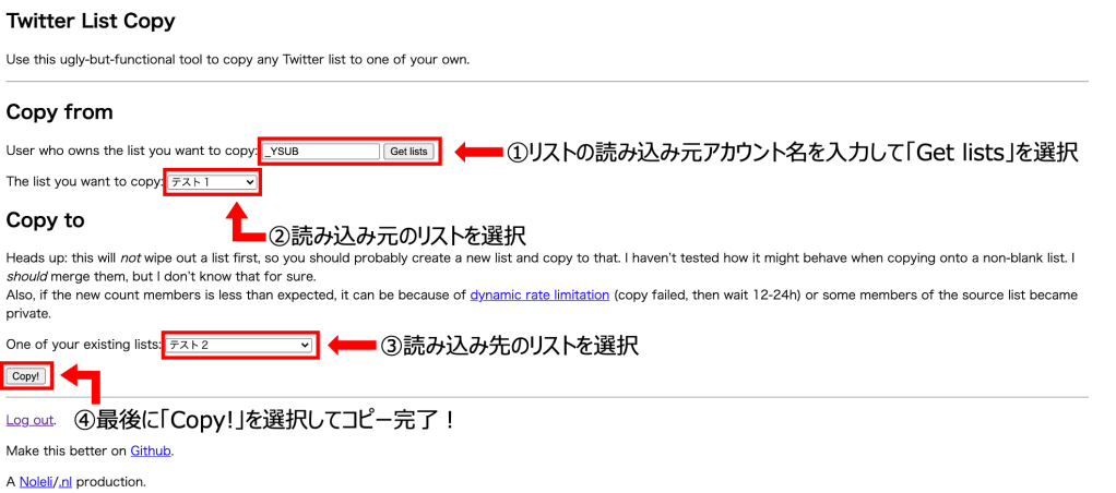 • ①リストの読み込み元のアカウント名を入力して「Get lists」を選択