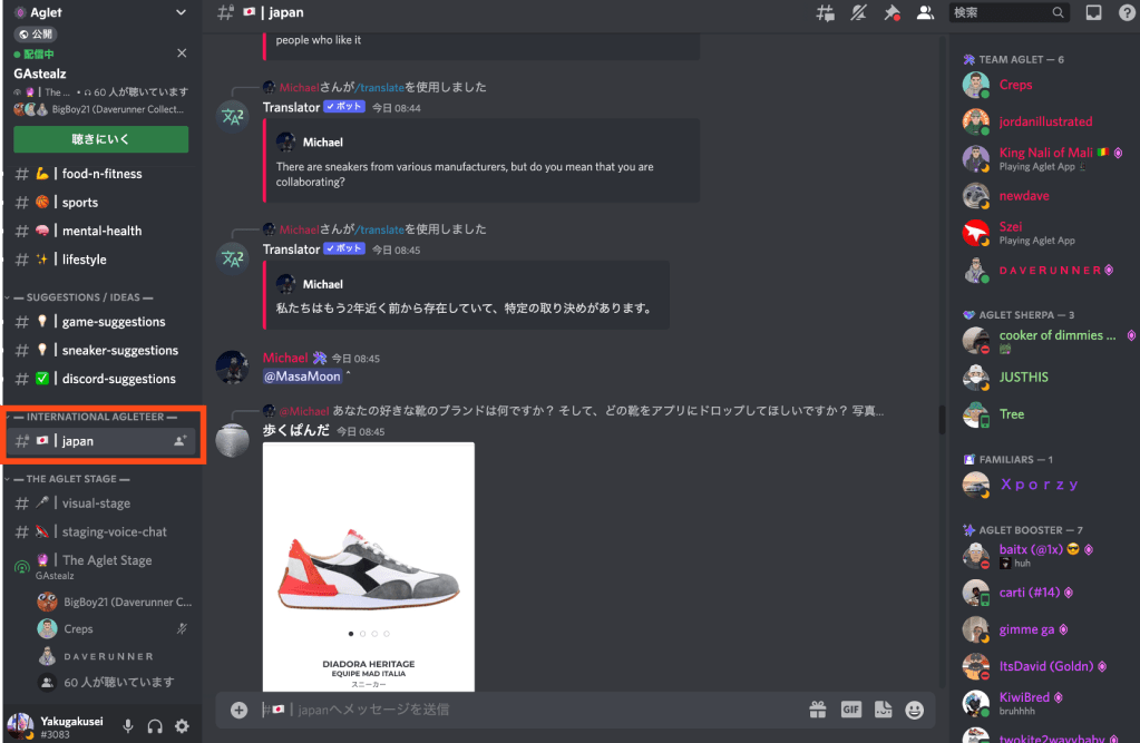 AGLET公式Discordのチャンネルを下にスクロールしていくと、🇯🇵 | japanというチャンネルがあります。こちらでは主に日本人ユーザーが情報交換をしているほか、運営側もGoogle翻訳を利用して頻繁に発言しています。
