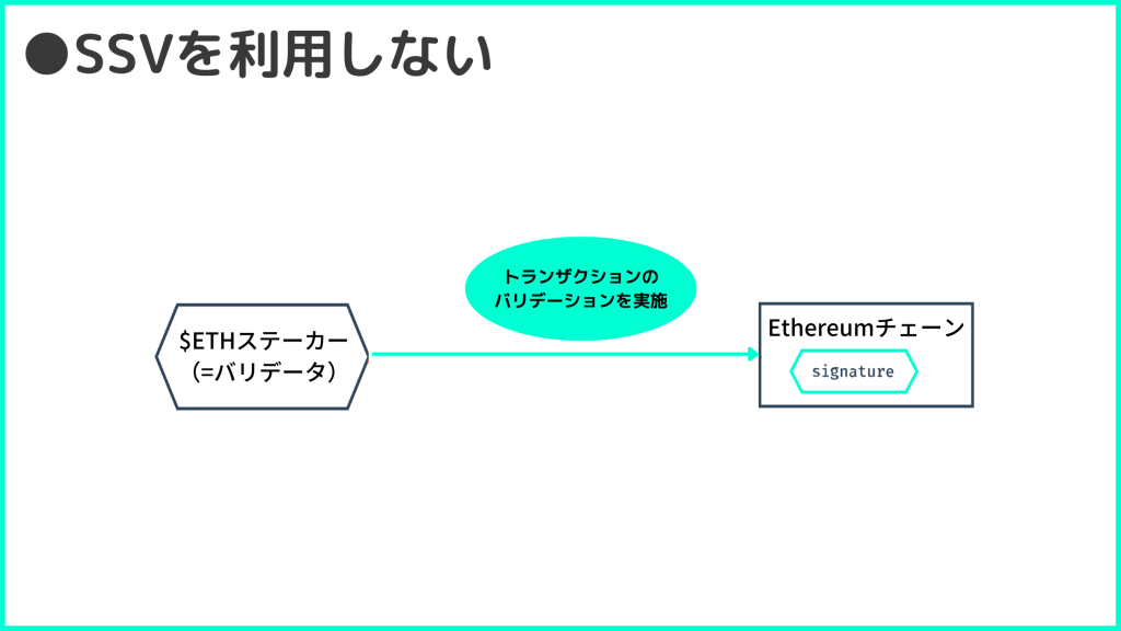 まず上の図がssvを利用しない場合のイメージになります。とてもシンプルな図ですね。$ETHをステーキングしている人がバリデータとしてトランザクションのバリデーションを実施することとなります。ただ、この場合の問題点として、バリデータがシステム障害などで正しくバリデーションを行えなかったりすると、報酬としてもらえる$ETHの量が減ってしまったり、最悪の場合バリデータから除名されるリスクがあります。