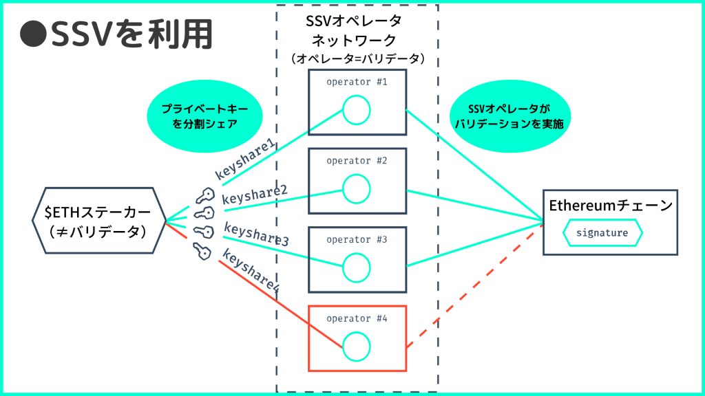 この問題を解決するのが、ssv.networkになります。ssv.networkでは$ETHをステーキングした方に割り当てられるプライベートキーを、独自の技術で分割シェアし、それを利用してssv.network上の複数のオペレータがバリデーションを実施できるようになります。