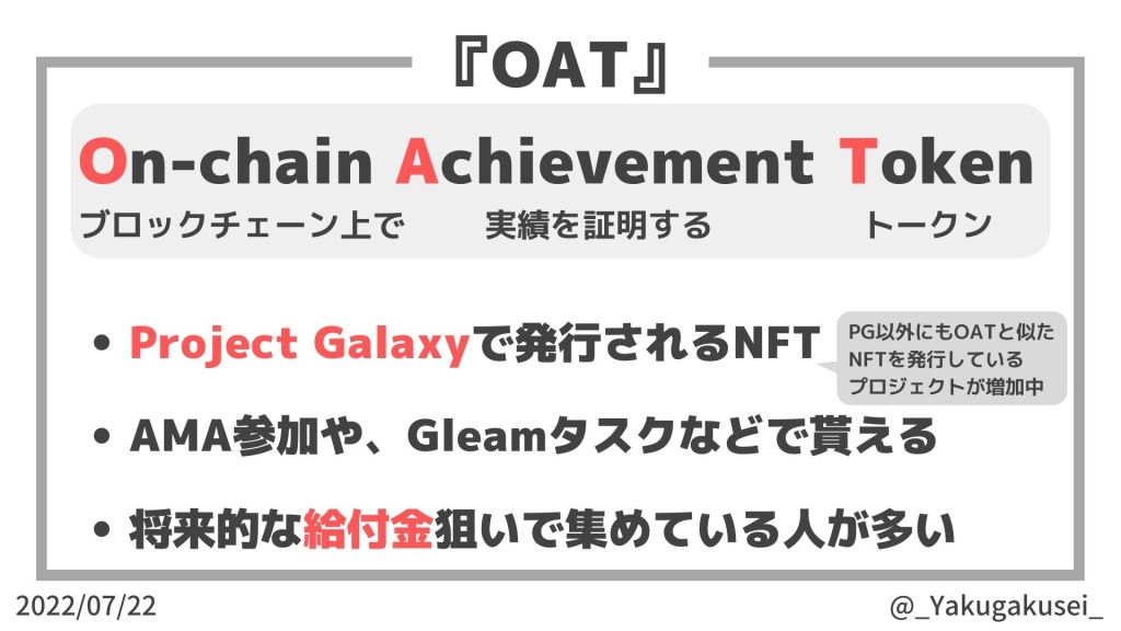 OATはOn-chain Achievement Tokenの略で、Project Galaxyというプロジェクトで発行されるNFTです。ユーザーはAMAに参加したり、TwitterフォローやGleamのタスクをこなすことでOATを獲得することができます。