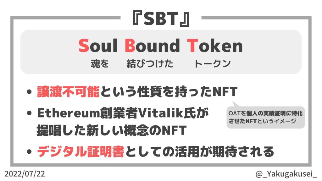 SBTはSoul Bound Tokenの略で、譲渡不可能という性質を持ったNFTです。