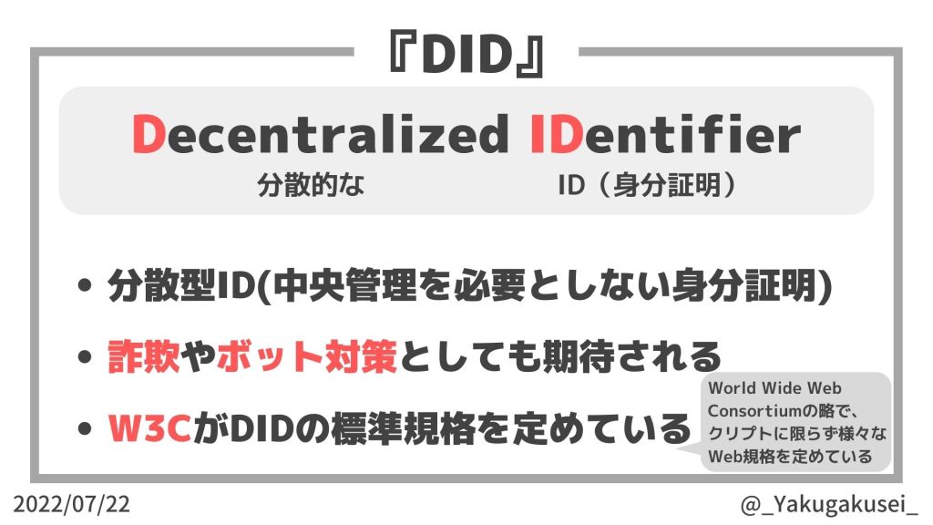 DIDはDecentralized IDentifierの略で、分散型IDと訳されます。