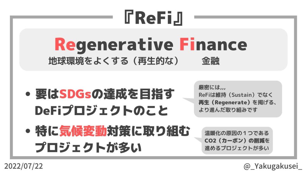 ReFiは、Regenerative Financeの略で、再生的な、地球環境をよくするプロジェクトのことを指します。