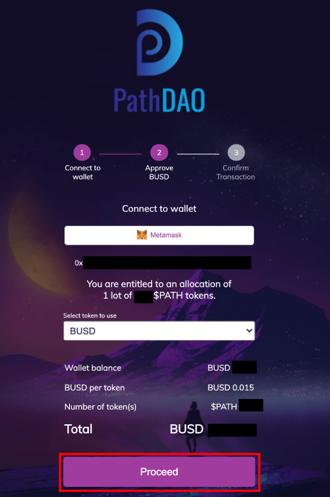 ウォレットを接続すると、自分のアロケーションが表示されますので、購入金額を確認の上、「Proceed」を選択します。