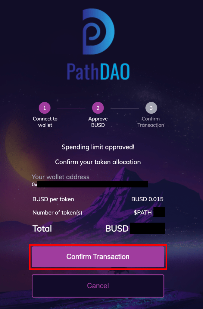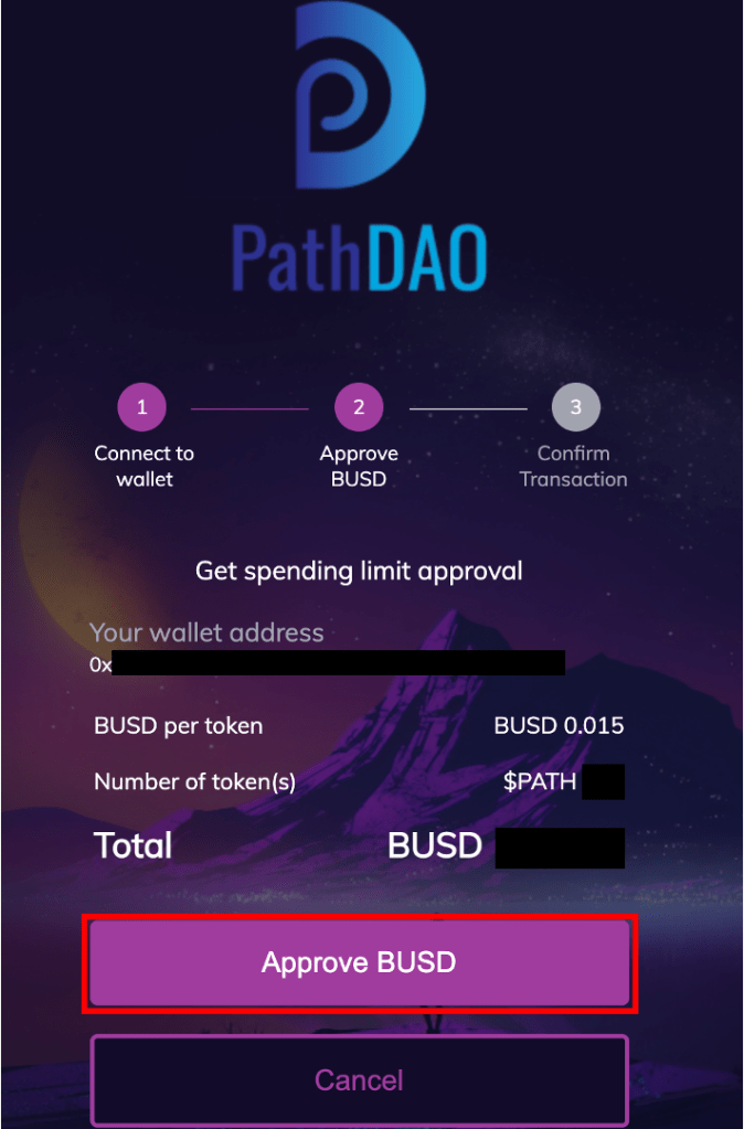 EnjinstarterでBUSDを使用する権限を与えて良いかの確認画面に移りますので「Approve BUSD」を選択します。なお、過去にEnjinstarterでIDOに参加したことがあったとしても、毎回BUSDをApproveする必要があります。