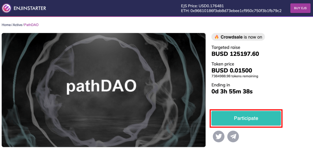 それでは、当日の参加方法について説明いたします。まず、Enjinstarterの「Active Projects」の中から、参加したいプロジェクトを選択します。今回は、「pathDAO」で説明を進めていきますので、pathDAOの「Learn More」を選択します。