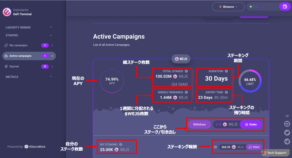 ステーキングページに表示される内容について、以下の画像でまとめて紹介していますので確認してみてください。